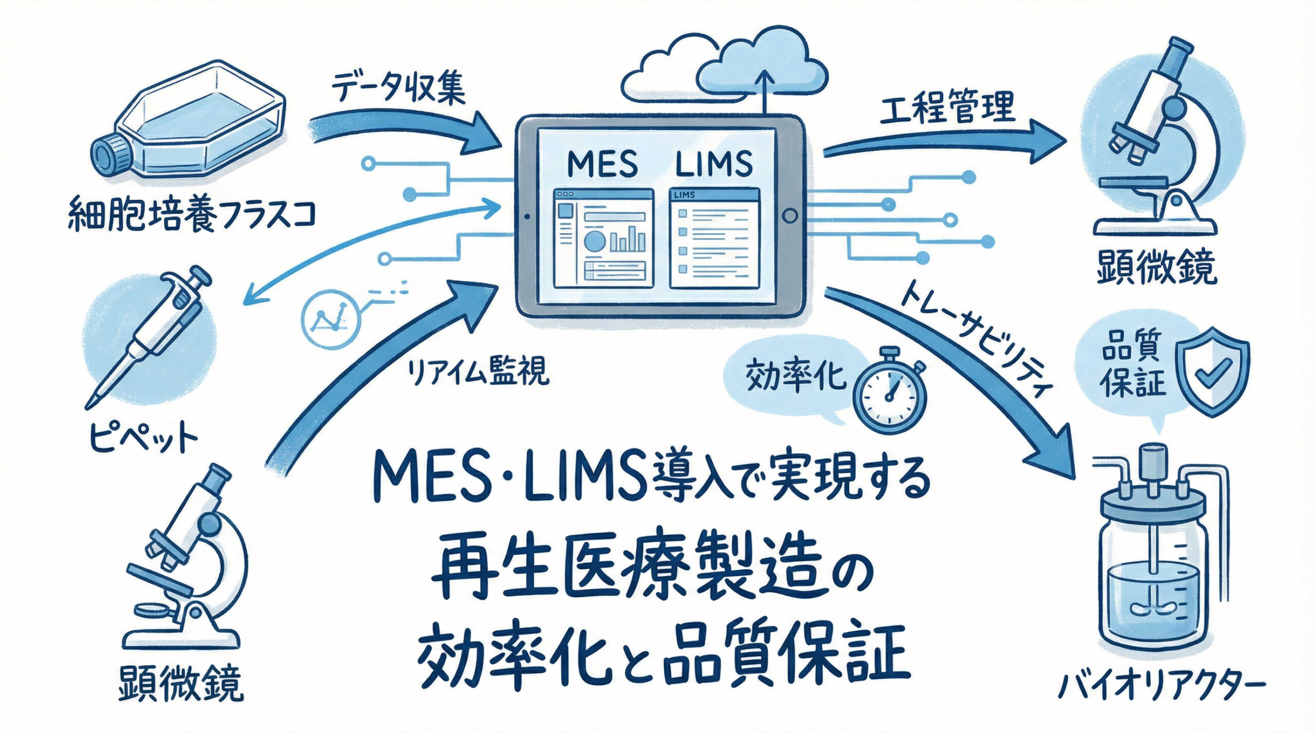 本記事では、再生医療製造における「MES(製造実行システム)」および「LIMS(ラボ情報管理システム)」の導入がもたらす製造管理の効率化について、具体的な効果や選定のポイントを詳しく解説いたします。デジタル化によるトレーサビリティの確保と業務効率化への道筋を、ご一緒に確認していきましょう。